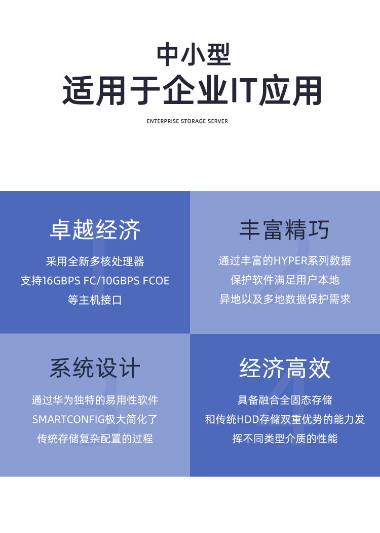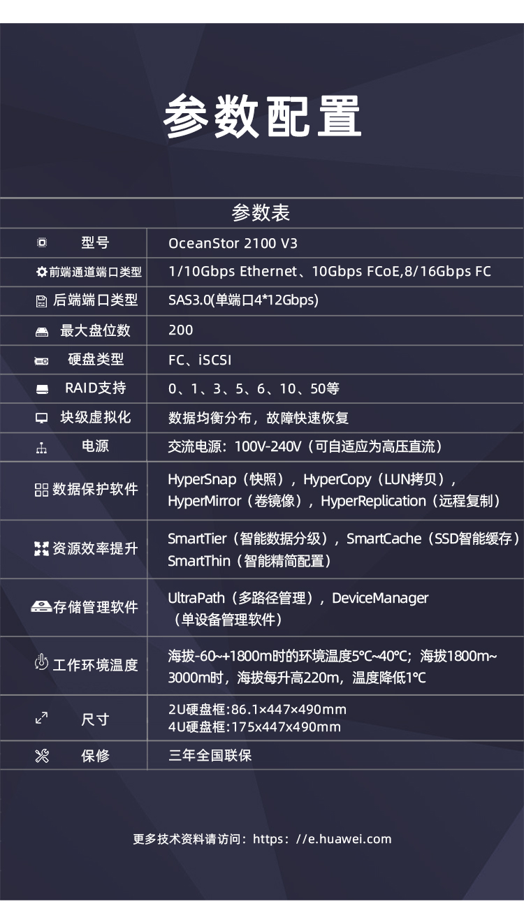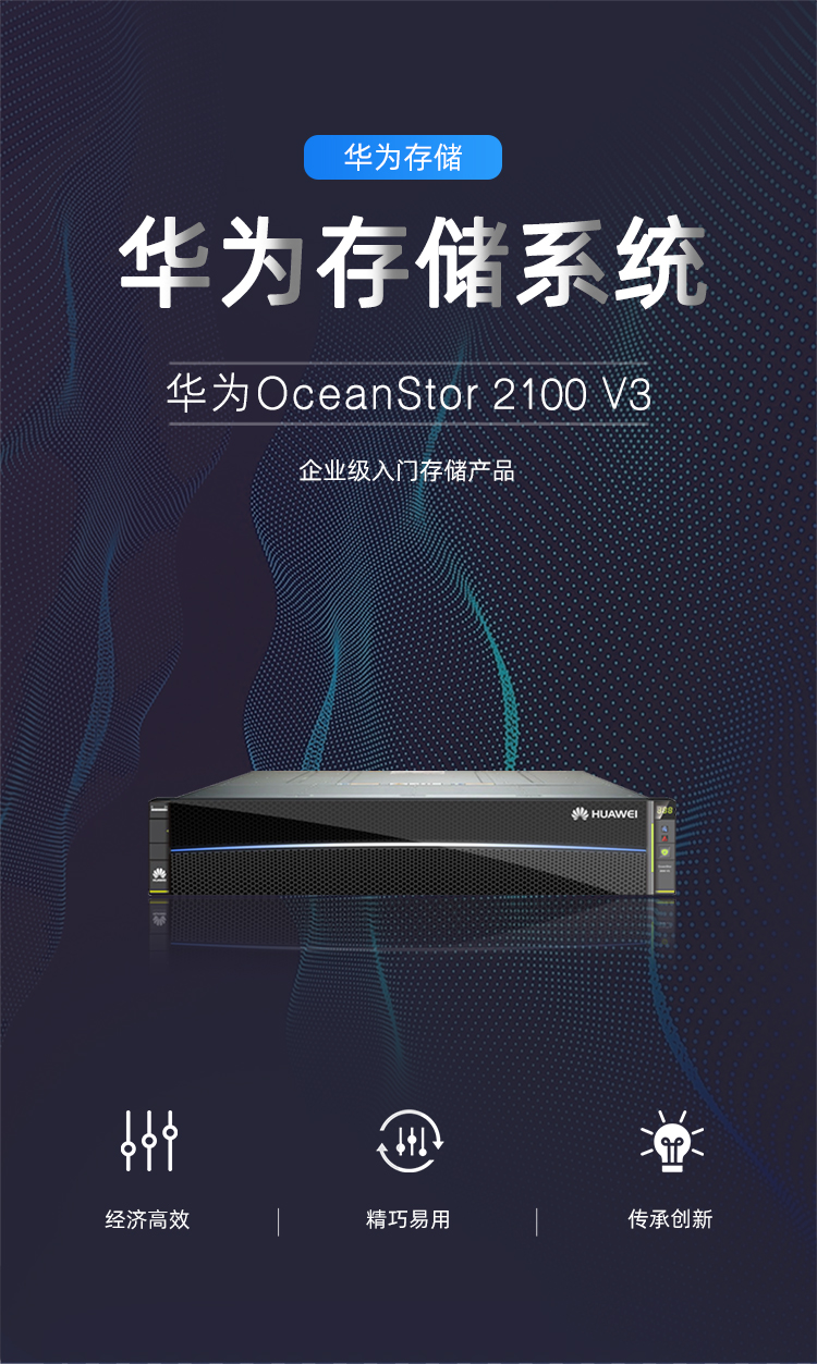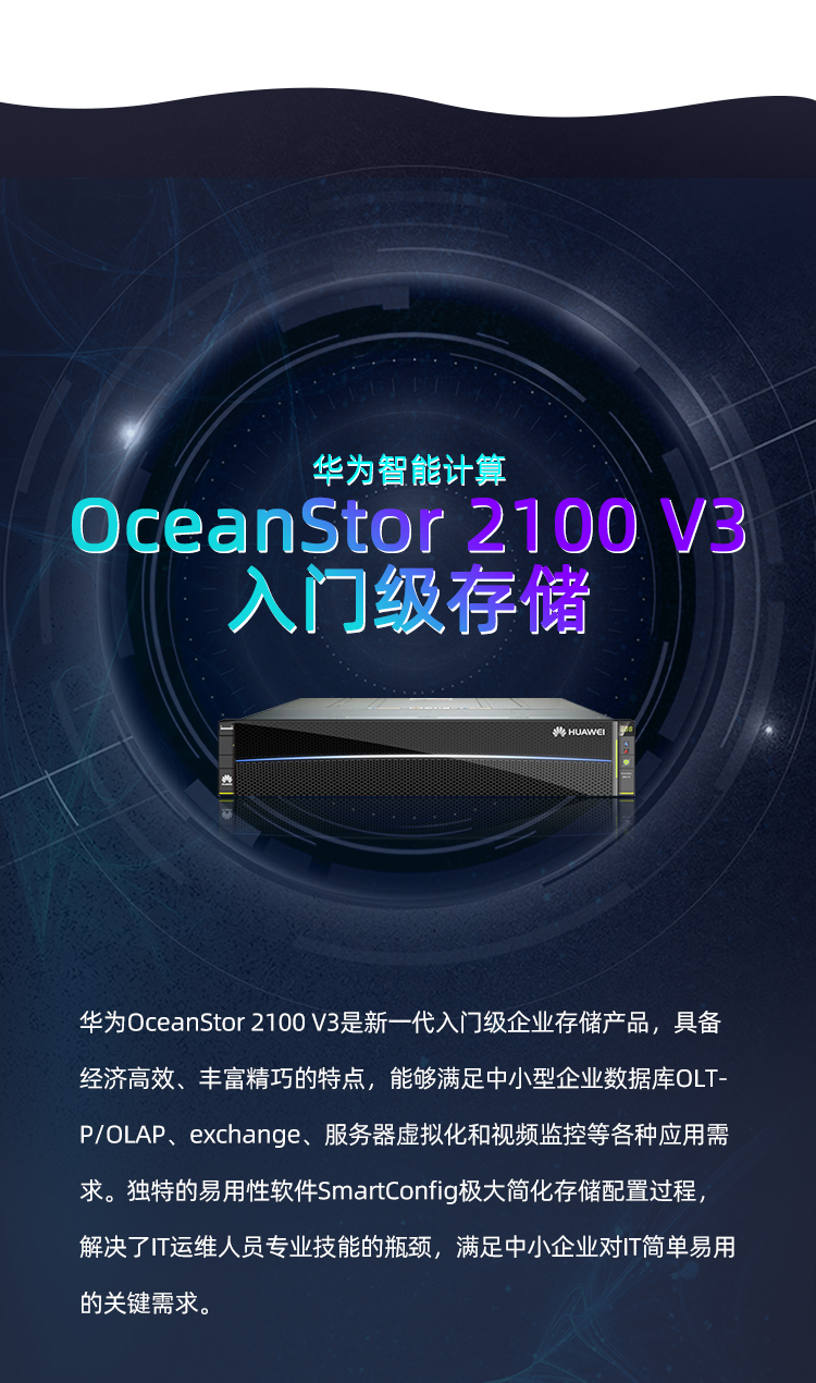 华为OceanStor 2100 V3是新一代入门级企业存储产品,具备经济高效、丰富精巧的特点,能够满足中小型企业数据库OLTP/OLAP、exchange、服务器虚拟化和视频监控等各种应用需求。