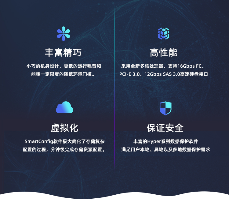 支持16Gbps FC等主机接口,采用新一代PCI-E3.0总线和12Gbps SAS 3.0高速硬盘接口,性能及规格全面领先同级产品。