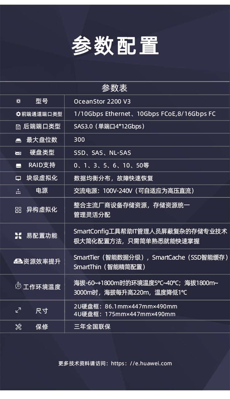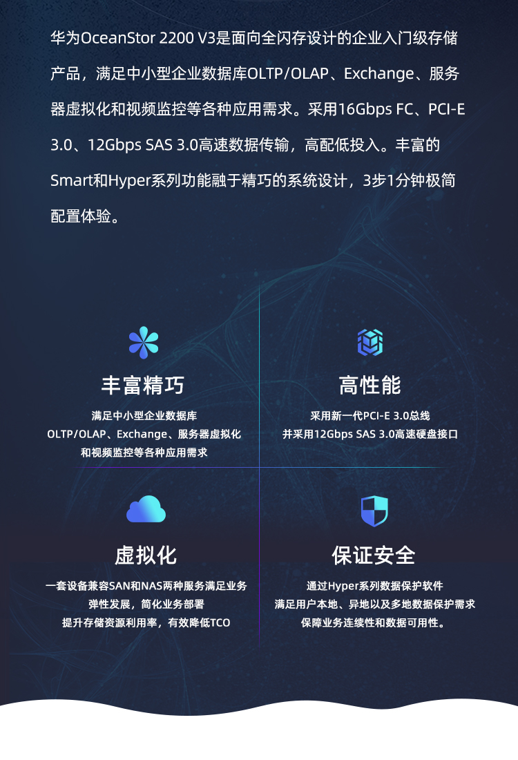 华为OceanStor 2200 V3是面向全闪存设计的企业入门级存储产品,满足中小型企业数据库OLTP/OLAP、Exchange、服务器虚拟化和视频监控等各种应用需求。