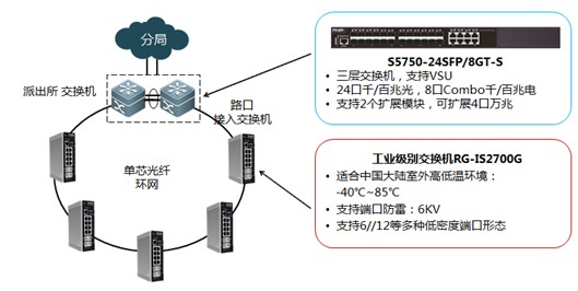 派出所交换机和所经路口的各接入交换机RG-IS2712G 共同组成一个单纤保护环。可以节省光纤资源。环上使用ERPS以太环网保护协议。可以实现<=20ms的快速切换,保障设备可靠性。