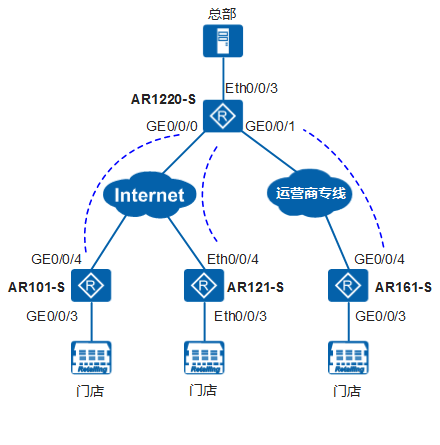 - AR1220-S作为总部出口网关,支持Internet和运营商专线两种接入方式,同时部署NAT业务,实现总部主机、运营商专线互联的门店主机访问公网资源。