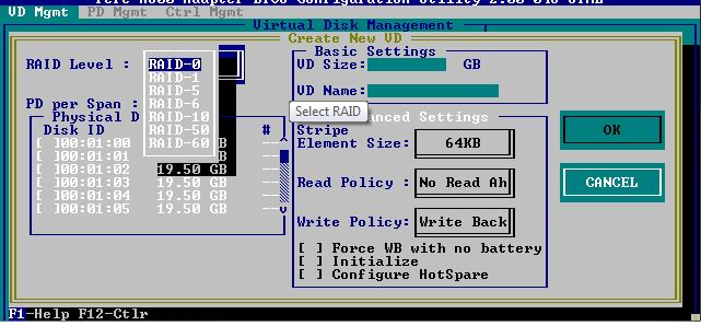 4. 选择Create New VD(创建新虚拟磁盘),然后按<Enter>键(图1[仅英文])。显示Create New VD(创建新虚拟磁盘)屏幕。光标此时位于RAID Levels(RAID 级别)选项上。将虚拟磁盘添加至磁盘组时,将显示Add VD in Disk Group(添加虚拟磁盘至磁盘组)屏幕。跳至步骤10可更改虚拟磁盘的基本设置