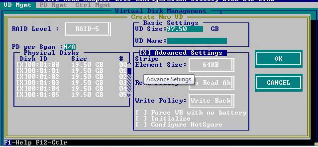 Advanced Settings(高级设置)旁边显示一个X。设置有磁条元素大小、读取策略和写入策略。您也可以选择高级选项,例如强制将高速缓存策略设置为Write-Back(回写式),初始化虚拟磁盘和配置专用热备用。