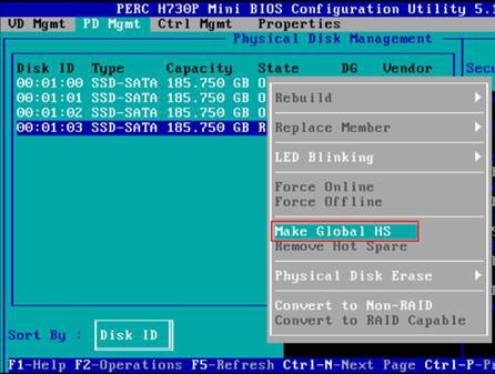 2. 要创建热备份盘的状态应为Ready,将光标移到要配置为热备份的磁盘后按下F2键后选择”Make Global HS”。