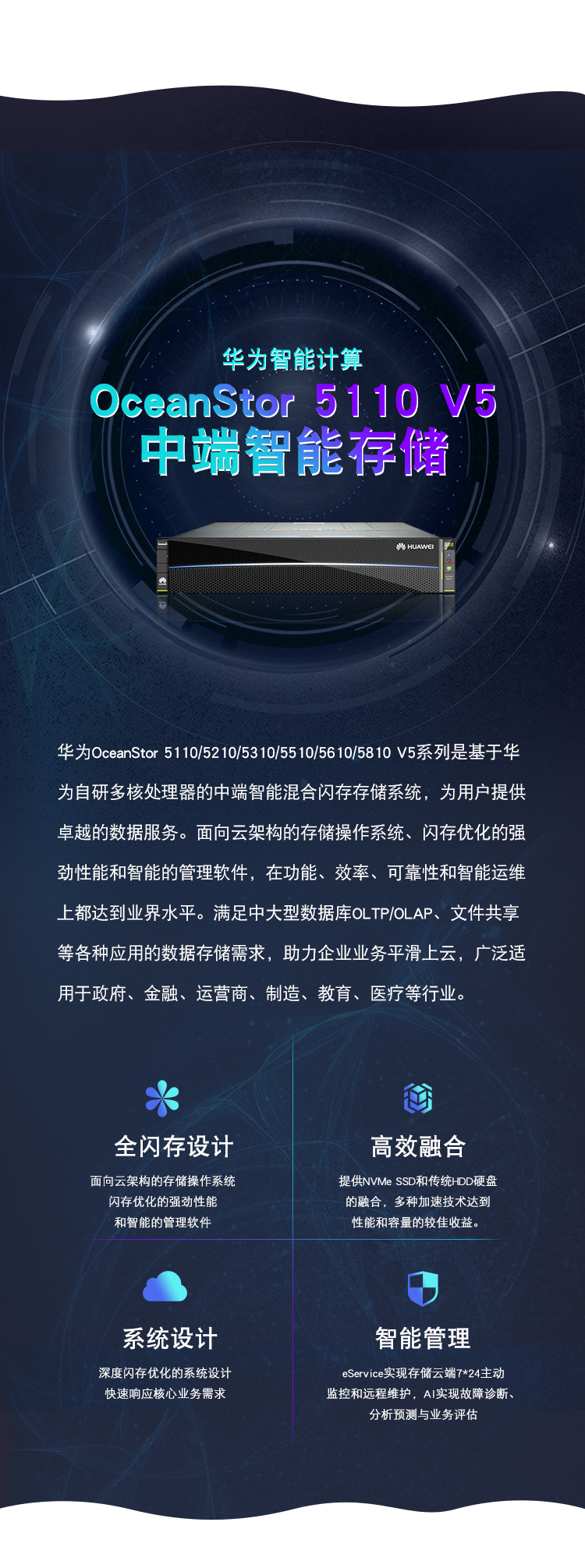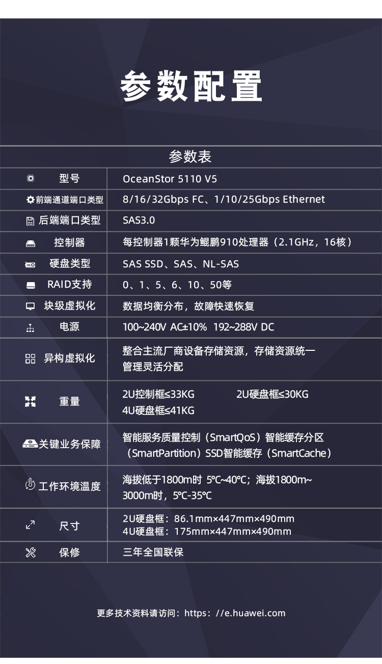 华为OceanStor 5110/5210/5310/5510/5610/5810 V5系列是基于华为自研多核处理器的中端智能混合闪存存储系统,为用户提供卓越的数据服务。