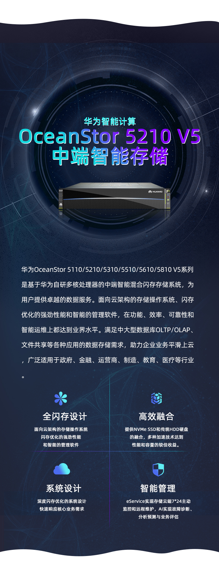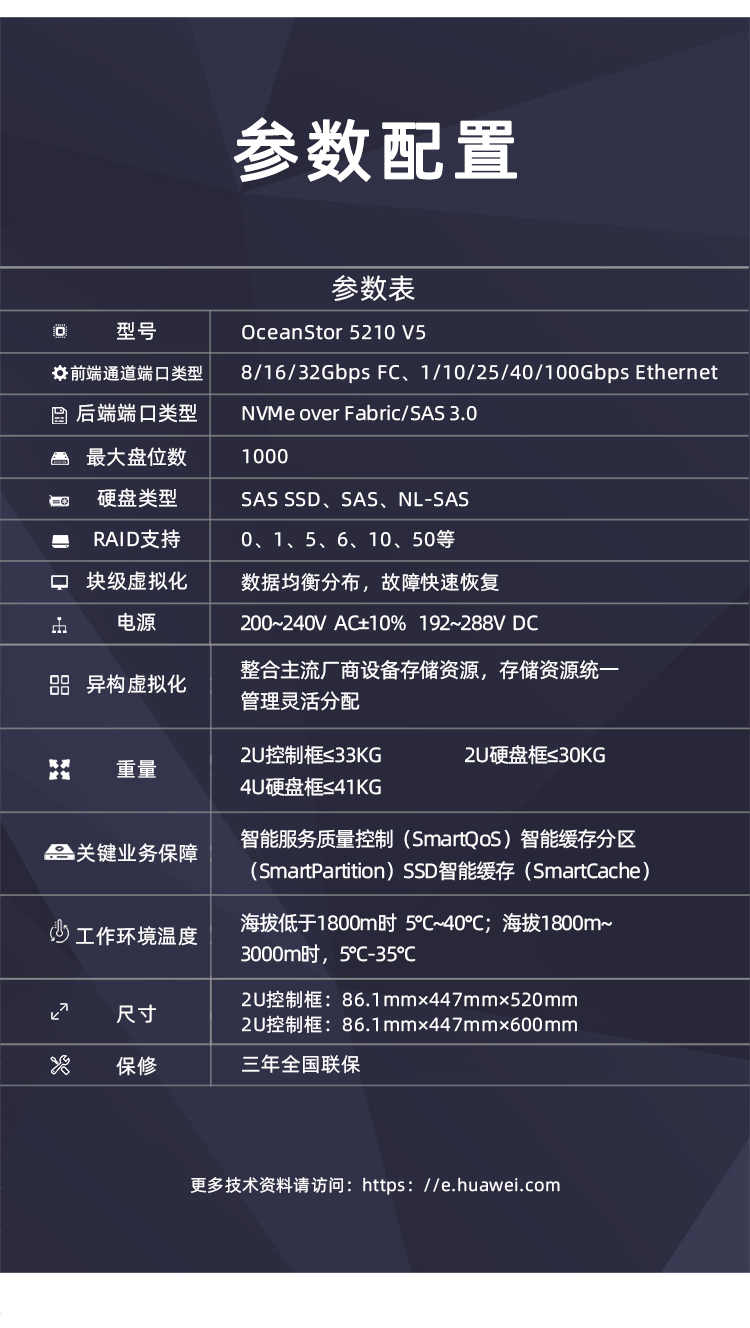 华为OceanStor 5110/5210/5310/5510/5610/5810 V5系列是基于华为自研多核处理器的中端智能混合闪存存储系统,为用户提供卓越的数据服务。
