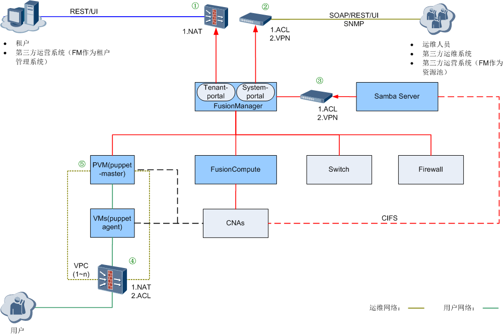 3. 由客户提供的Samba服务器与FusionManager对接,供用户上传下载ISO镜像和软件。一般情况下,Samba服务器与FusionManager系统处于一个信任网络(信任域)内,可以通过VPN相通。