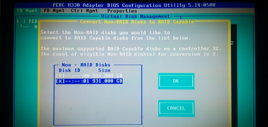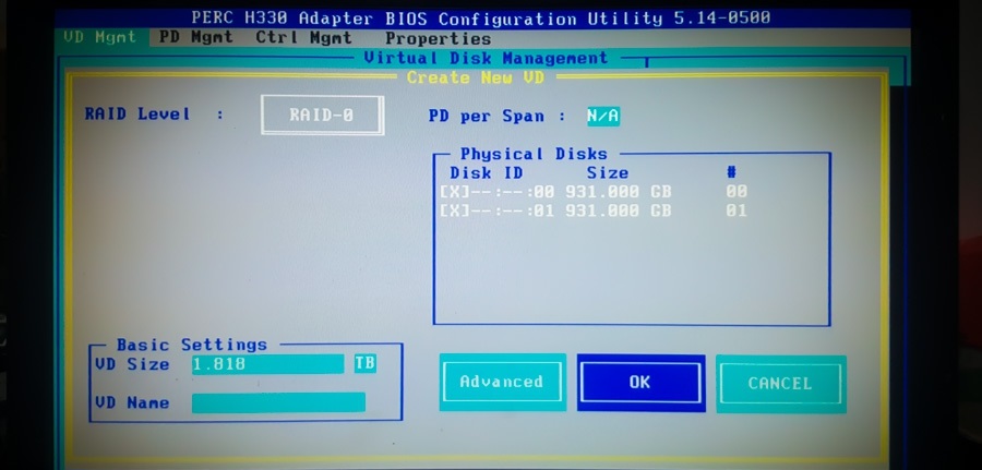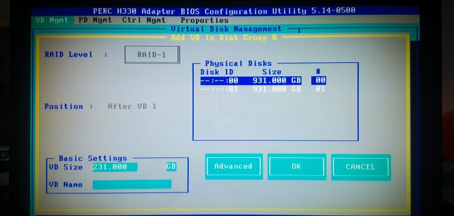 当然,我们也可以做 Raid1,实现备份阵列功能,注意我们手动输入的虚拟磁盘容量 VD Size 为 231GB