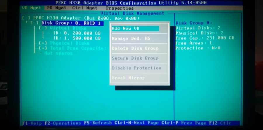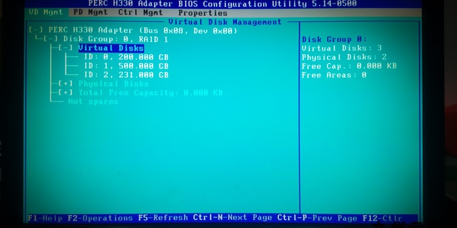 我们可以最终看到在 Raid 配置界面里,进行的虚拟磁盘容量划分,三个虚拟磁盘,分别为 200G,500G,231G