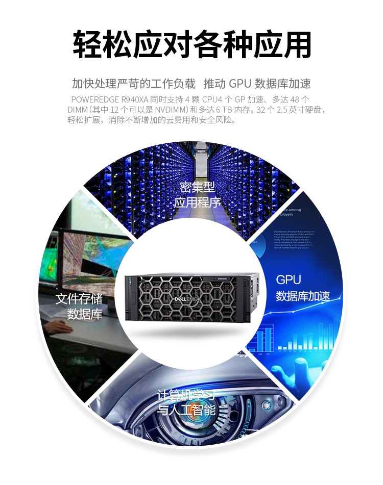Dell EMC PowerEdge R940xa机架式服务器 四路 4RU服务器(英特尔) 加速获得业务见解 借助功能强大的四路服务器,针对业务关键型应用程序推动GPU数据库加速。凭借大容量内部存储扩展容量。 快速将数据分析结果转化为业务成果 PowerEdge R940xa可加快应用程序运行速度,以提供实时决策。R940xa以1:1的强大比率结合了4个CPU和4个GPU,以推动数据库加速。R940xa可配多达6 TB内存和四路性能,从而提供一致且快速的响应速度。扩展内部容量,以消除不断增加的云费用和安全风险。 合适的工作负载: 计算密集型应用程序 机器学习和人工智能 GPU数据库加速 直接咨询客服询价