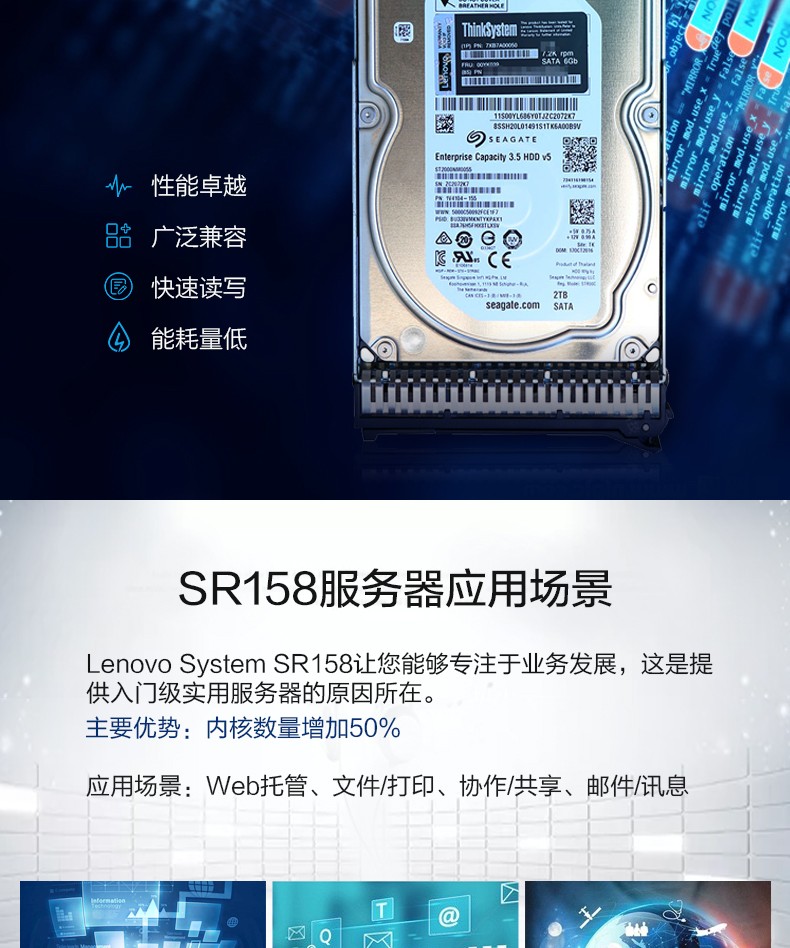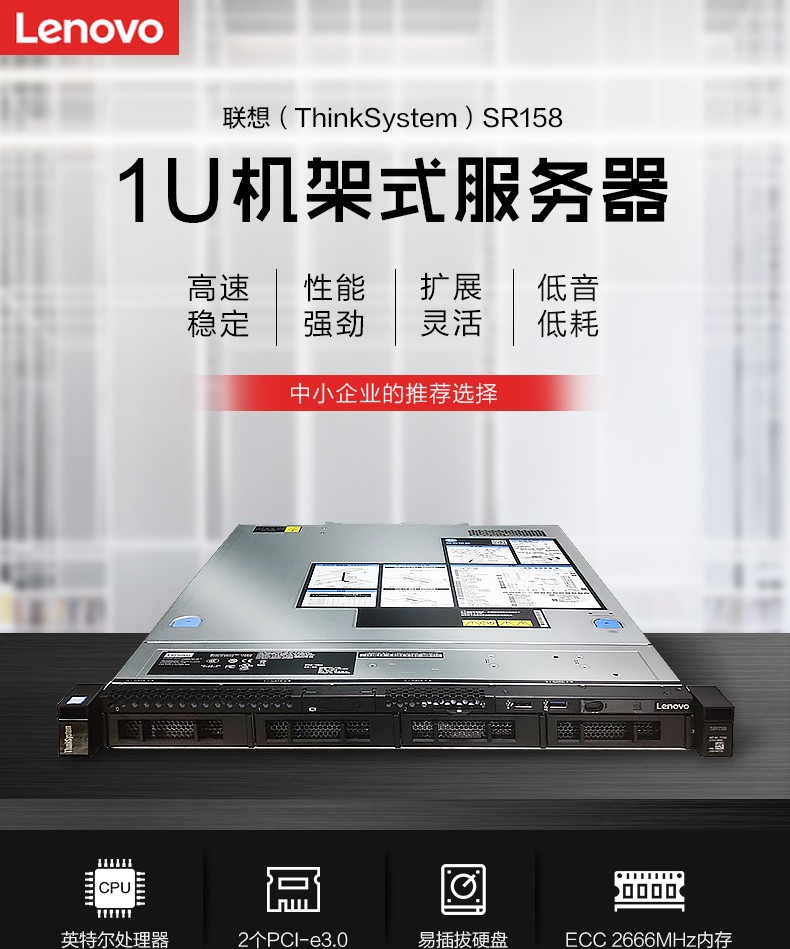 联想ThinkSystemSR158是一款面向增长型中小型企业(SMB)的价值导向机架式服务器。它搭载新英特尔至强处理器,具有联想久负盛名的可靠性,并通过lU外型实现内置灵活性,可提供极其强大的处理能力。SR158可处理多种工作负载,是Web托管 、 邮件服务、 文件闭印服务、 视频流甚至通用IT应用的理想选择。