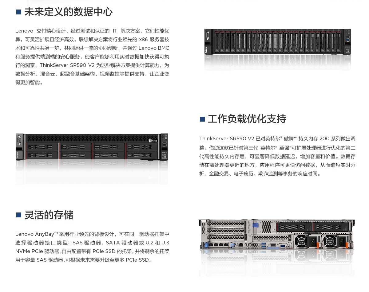 Lenovo ThinkSystem 旨在为需要双路处理器和大容量内存的机架环境设计,可以满足大中型企业对于云和大数据环境的需求。SR590 V2是一款平衡的中端机架式服务器,也非常适合小规模虚拟化、协作和生产力应用程序,一级缓存和日志记录。