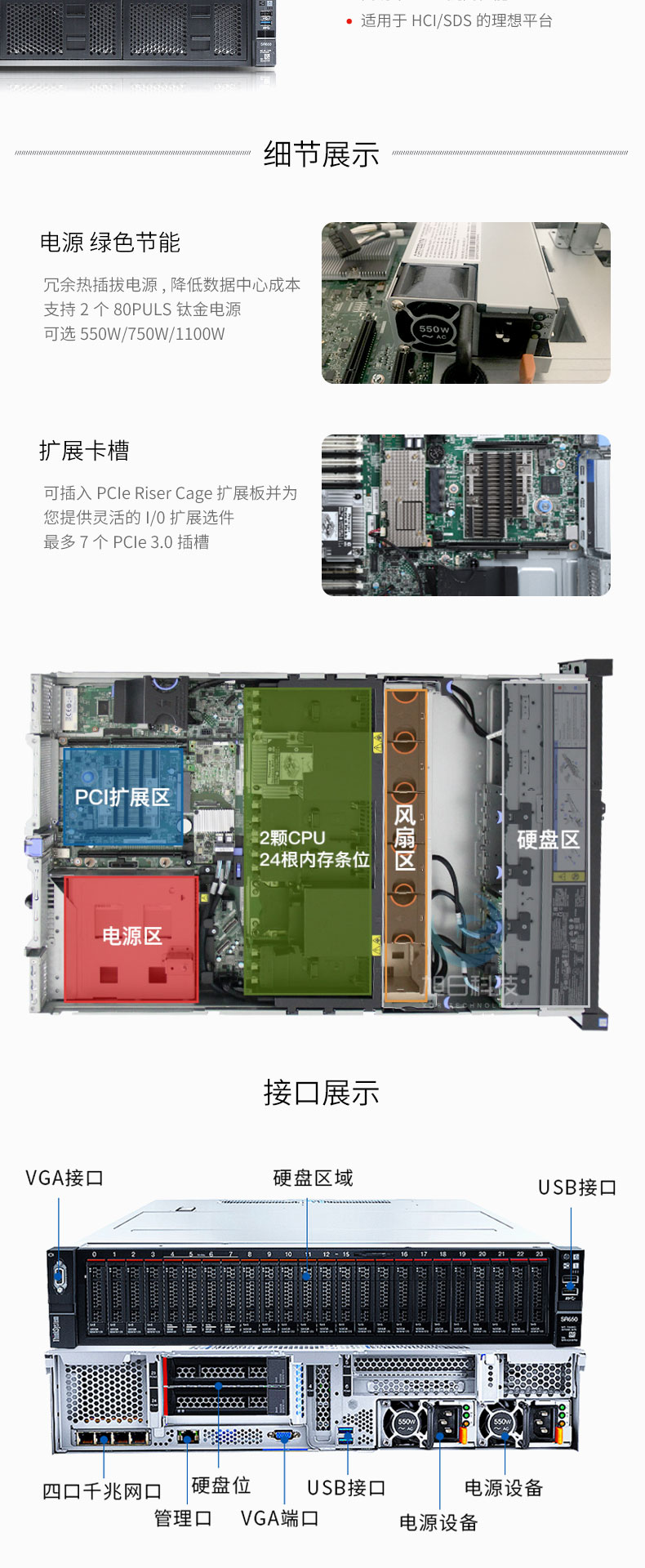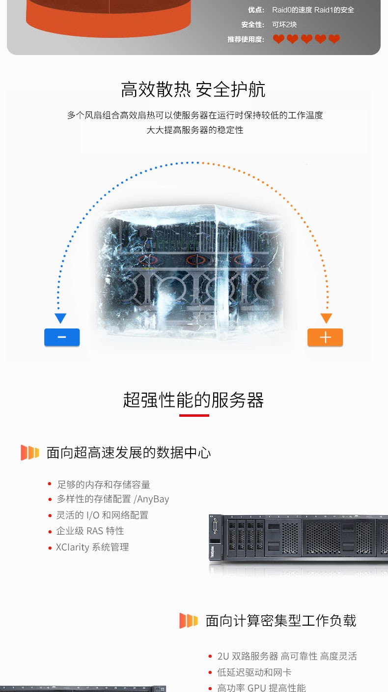 SR650服务器提供基本或高级硬件RAID保护和各种网络选项,包括可选的LOM,ML2和PCIe网络适配器。下一代联想XClarity控制器内置于SR650服务器中,可提供高级服务处理器控制,监控和警报功能。