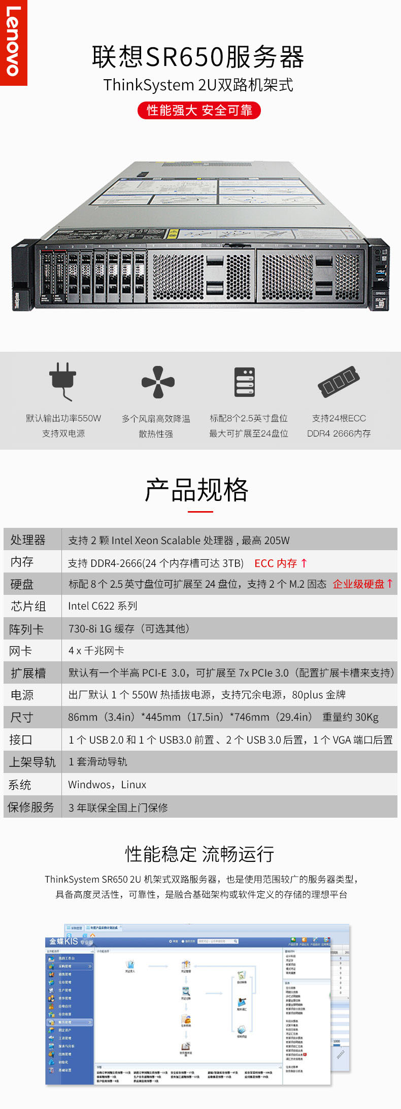 联想ThinkSystem SR650是一款理想的双插槽2U机架式服务器,适用于需要业界领先的可靠性,管理和安全性的小型企业,以及化性能和灵活性,以便于未来发展。SR650服务器旨在处理各种工作负载,例如数据库,虚拟化和云计算,虚拟桌面基础架构(VDI),企业应用程序,协作/电子邮件以及业务分析和大数据。
