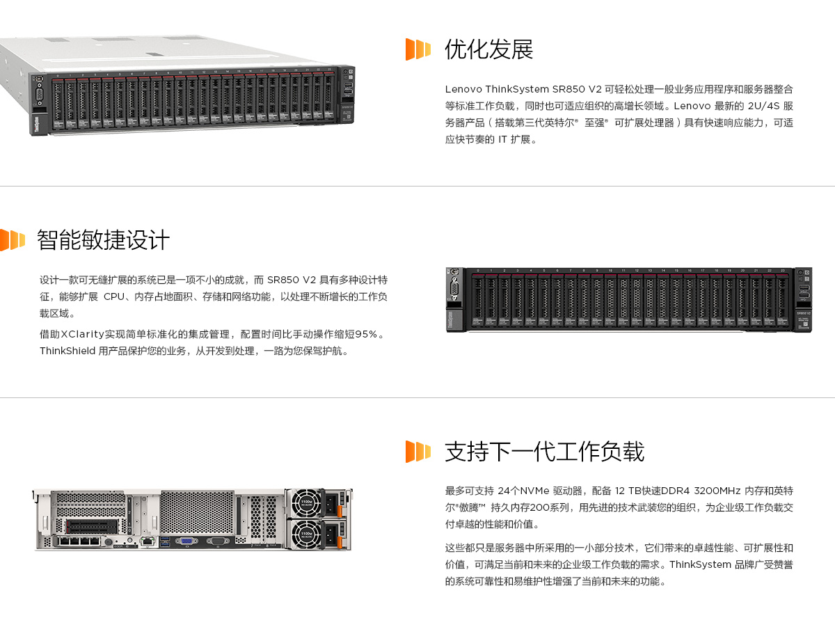 最多可支持24个NVMe驱动器,配备12TB快速DDR43200MHz内存和英特尔做腾持久内存200系列,用先进的技术武装您的组织,为企业级工作负载交付卓越的性能和价值。