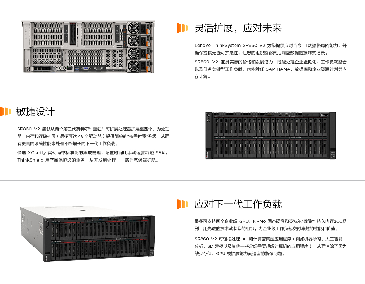 ThinkSystem SR860 V2 设计巧妙,可在行业标准的 x86 平台中提供经济实惠的可扩展性。