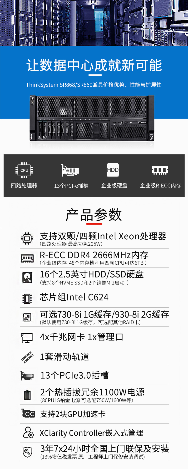 Lenovo ThinkSystem SR868旨在实现出色的性价比。它提供您今天需要的速度和可靠性,以及明天将需要的可扩展性和多功能性。