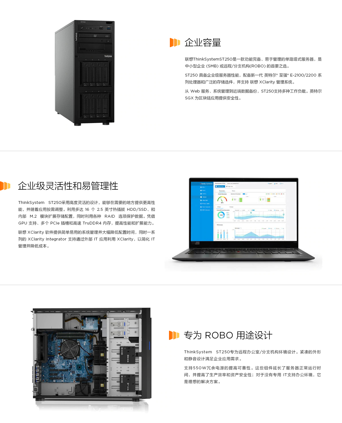 Lenovo ThinkServer TS250是中小企业、远程或分支办事处及零售环境的理想服务器。它采用新技术来提供强大的企业级功能。英特尔® 至强® E3-1200 v6系列处理器包含最多4个内核和集成显卡,而且可支持64GB的 2400MHz DDR4内存。这些特性使您可以比以前更快地运行 更大型工作负载,甚至可以运行虚拟机(VM),进而更好地利用服务器。TS250中内置的英特尔® Active Management Technology(AMT)提供了简便易用的行业标准管理工具, 可帮助轻松完成监控、更新和修复工作。TS250能够以接近高等级台式机的价格提供更高的性能。