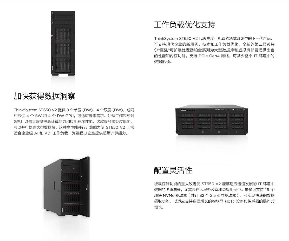 Thinksystem ST650V2代表高度可配置的塔式系统中的下一代产品,可支持现代企业的新用例、技术和工作负载优化。全新的第三代英特尔至强可扩展处理器铂金系列为大型数据库和虚拟机部署提供出色的性能和内存功能,支持 Pcle Gen4网络,可减少整个T环境中的数据瓶颈。