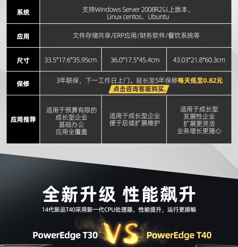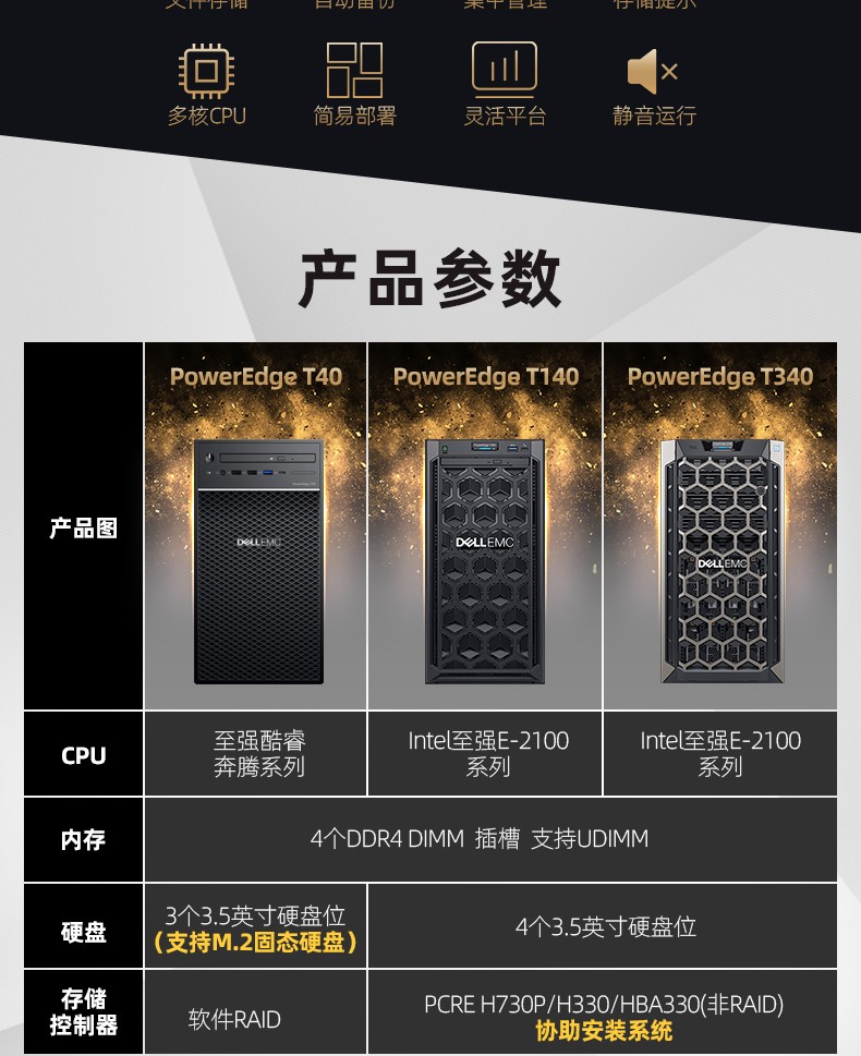 Dell EMC PowerEdge T140单路塔式服务器(英特尔) 集中精力发展业务,把IT交给我们来处理 易于使用、安全且实用的入门级服务器,适用于成长型企业。非常适合文件和打印以及销售点应用程序。 实用的入门级服务器 Dell EMC PowerEdge T140让您能够专注于业务发展,这就是我们提供入门级实用业务服务器的原因所在。在一个中央数据存储库中整理数据。 T140使您能够以经济实惠的方式处理常见的业务工作负载。 适合于以下类型的业务应用程序: 文件和打印 邮件和消息传送 销售点 财务 直接咨询客服询价